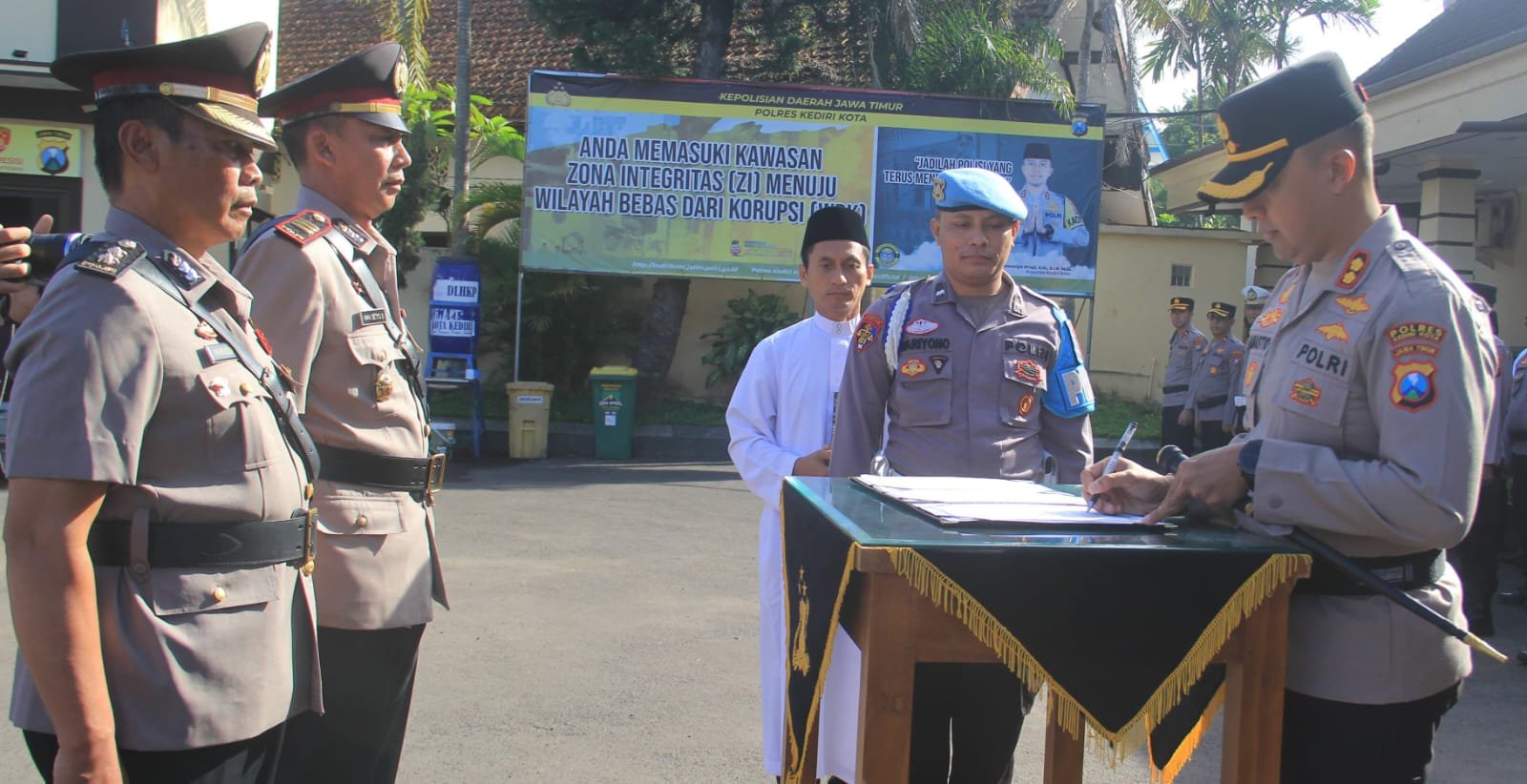 Serah terima jabatan (Sertijab) dipimpin langsung Kapolres Kediri Kota, AKBP Bramastyo Priaji bertempat di halaman Mapolres Kediri Kota, Senin (28/4/2025).