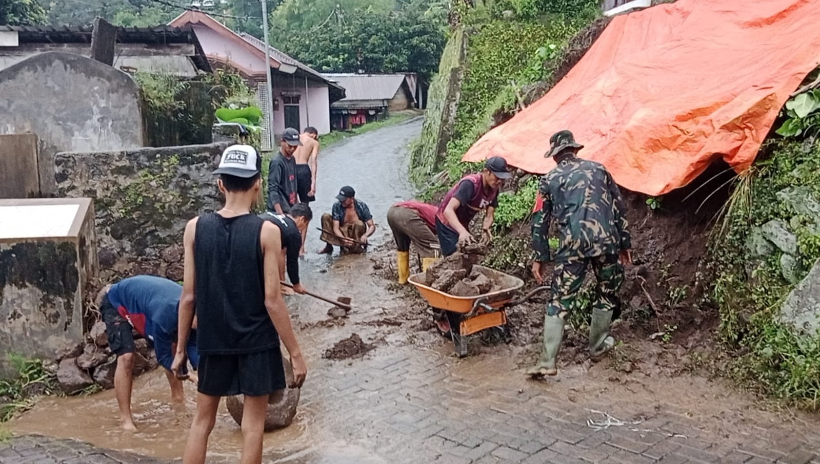Dengan sigap Sertu Agus bersama Babinkamtibmas serta warga masyarakat melaksanakan Gotong Royong membersihkan material TPT yang ambrol akibat hujan lebat.