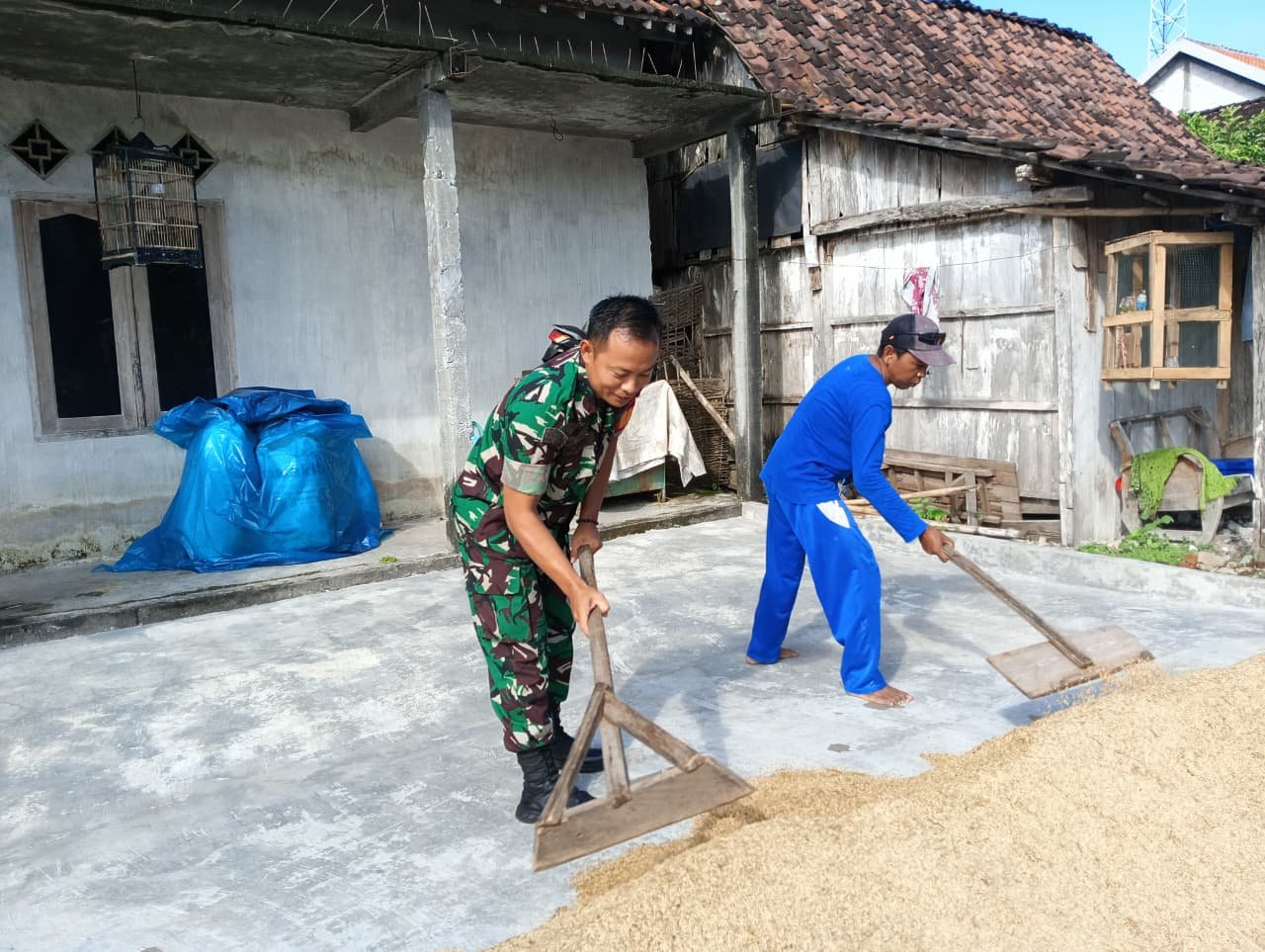 Babinsa Koramil 07,Kabuh Kodim 0814/Jombang membantu petani yang sedang menjemur padi usai dipanen beberapa waktu lalu. Terlihat Babinsa Koptu Khoirul ikut bersama bapak jumadi (petani) menjemur padi di Desa Sumbergondang Kecamatan Kabuh, Kab. jombang, Senin (16/03/2026)