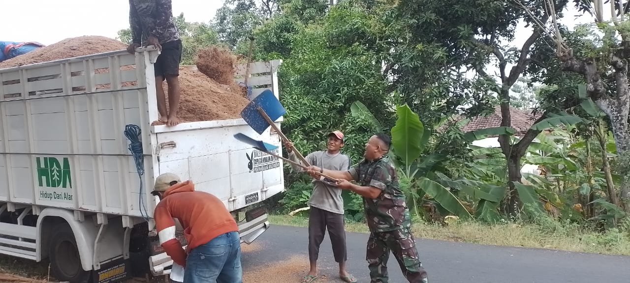 Babinsa Koramil 0820-09/Lumbang Serma Jufri bersama warga Dusun Krajan, Desa Brangga, Kecamatan Lumbang, melaksanakan kegiatan pengangkutan serbuk Kayu (Foto Istimewa)