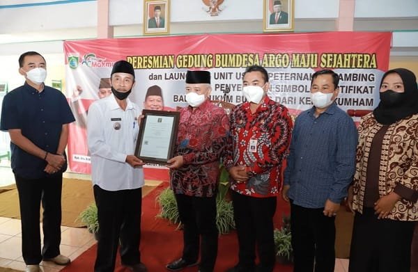KABUPATEN MALANG, SUDUTPANDANG.ID – Bupati Malang, H.M Sanusi, meresmikan Kantor dan Gedung baru Badan Usaha Milik Desa (BUMDes) Argo Maju Sejahtera, Desa Argoyuwono. Bupati juga me-launching unit usaha peternakan kambing, serta penyerahan secara simbolis sertifikat badan hukum BUMDes dari Kemenkumham di Balai Desa Argoyuwono, Kecamatan Ampelgading, Kabupaten Malang, Sabtu (15/1/2022).