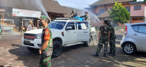 GIANYAR, SUDUTPANDANG.ID – Dalam rangka mencegah penyebaran virus Covid-19 varian Omicron, Kodim Gianyar melalui Koramil Ubud bekerja sama dengan Korem Wira Satya melakukan penyemprotan eco enzyme di seputaran Jalan Raya Desa Peliatan dan Puri Agung Peliatan Kecamatan Ubud, Kabupaten Gianyar, Bali, Sabtu (19/2/2022).