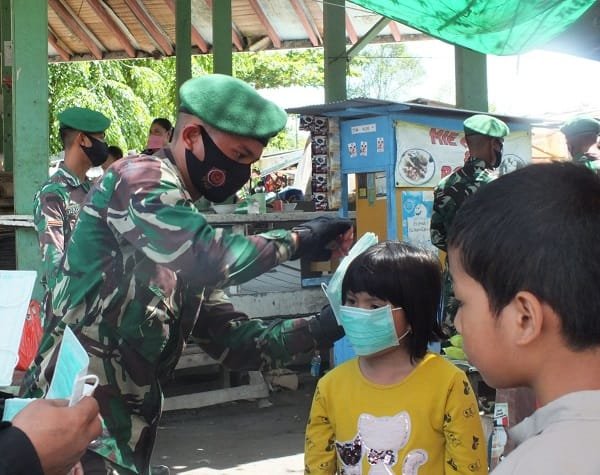 Kodim 1014/Pangkalan Bun membagikan masker kepada masyarakat di wilayah Kecamatan Arut, Kotawaringin Barat (Kobar), Kalimantan Tengah/ist