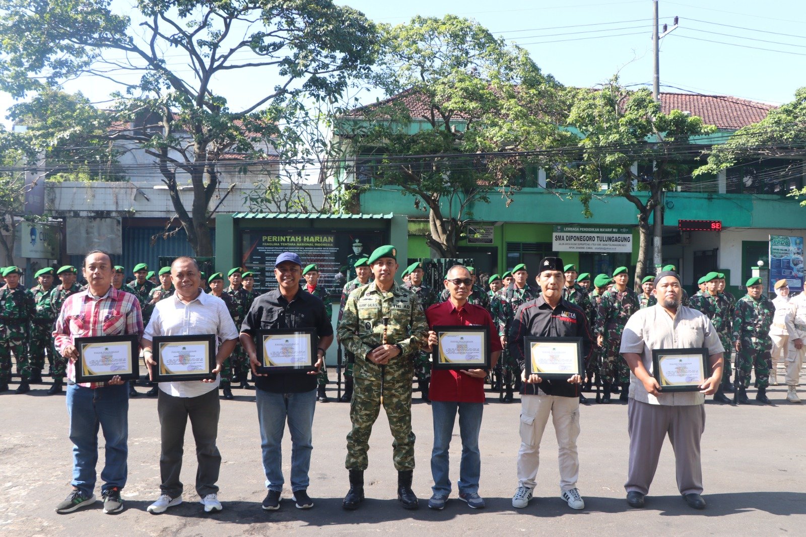 TULUNGAGUNG – JATIM | SUDUTPANDANG.ID – Komandan Kodim 0807/Tulungagung Letkol Arh Hanny Galih Satrio, S.I.P., M.Han., memberikan piagam penghargaan kepada sejumlah insan media tepat usai pelaksanaan upacara bendera di halaman Makodim 0807/Tulungagung, Jl. Jaksa Agung Suprapto No. 17, Kelurahan Kampungdalem, Kecamatan Tulungagung, Kabupaten Tulungagung, Jawa Timur, Selasa (17/03/2026).