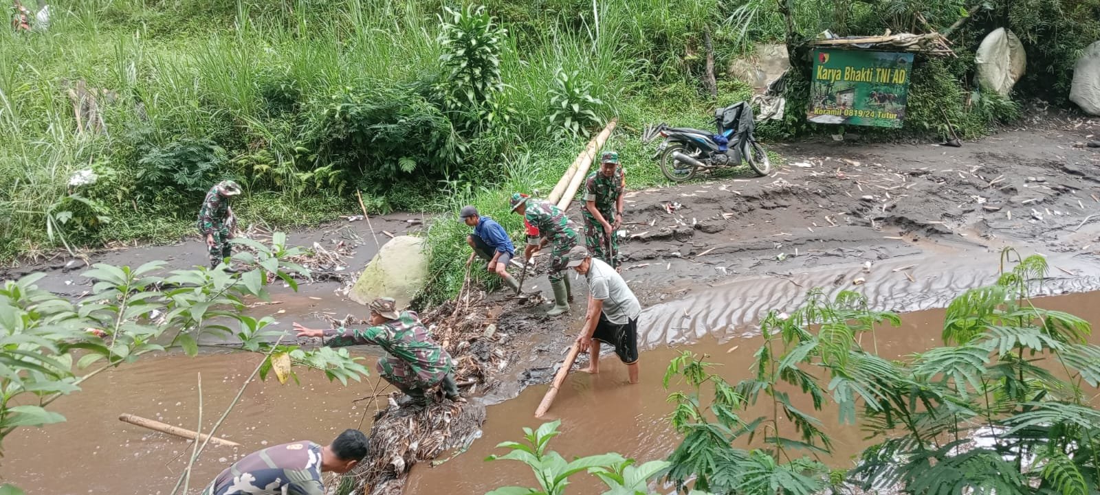 Anggota Koramil bersama masyarakat setempat bergotong-royong membersihkan aliran sungai (Foto Istimewa)