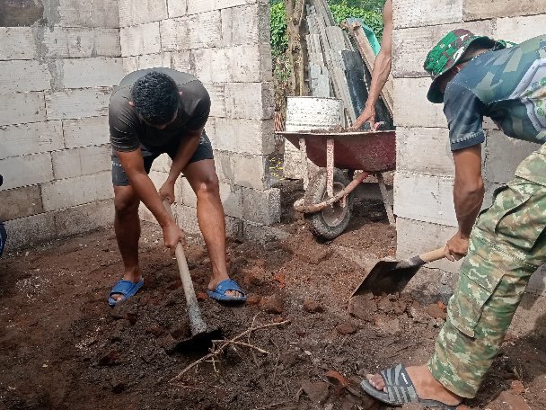 Melalui program TNI Manunggal Membangun Desa (TMMD) ke-127 yang dilaksanakan Kodim 0819/Pasuruan, rumah itu kini berangsur berubah. Prajurit dan warga desa bekerja berdampingan, mengaduk semen, meratakan pondasi, dan menyusun bata tanpa sekat.