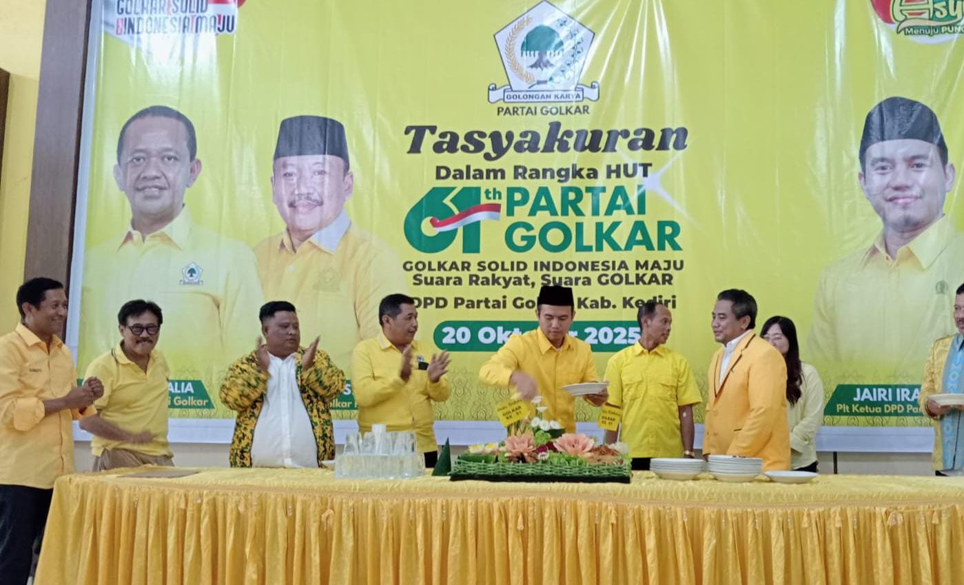 KEDIRI, SUDUTPANDANG.ID – Dalam rangka memperingati Hari Ulang Tahun (HUT) ke-61 Partai Golkar, Dewan Pimpinan Daerah (DPD) Partai Golkar Kabupaten Kediri menggelar acara tasyakuran penuh kebersamaan, Senin (20/10/2025). Kegiatan ini dihadiri oleh pengurus, kader, dan simpatisan Partai Golkar se-Kabupaten Kediri.