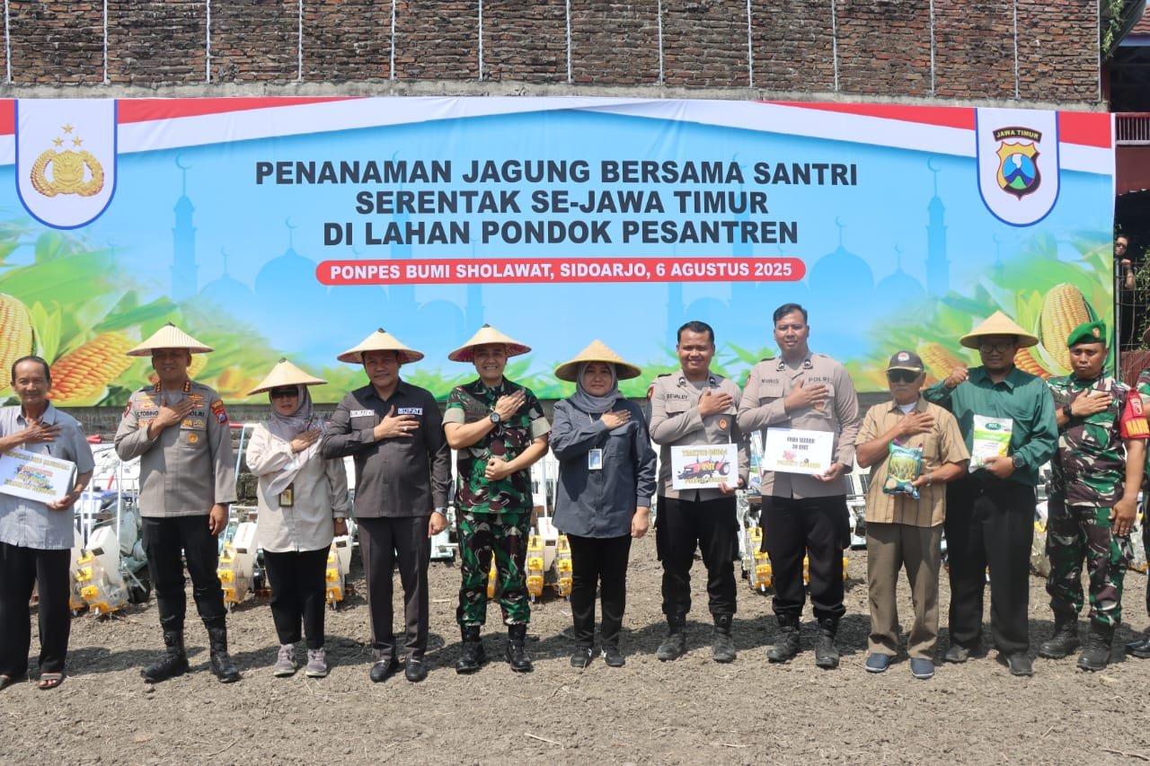 SIDOARJO – JATIM | SUDUTPANDANG.ID – Forkopimda Sidoarjo melakukan penanamam jagung serentak di lahan Pondok Pesantren Bumi Sholawat, Rabu (6/8/2025). Kegiatan dari upaya mendukung program ketahanan pangan nasional sesuai Asta Cita Presiden Prabowo Subianto ini diadakan Polri dengan menggandeng Pesantren di Jawa Timur.