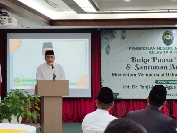 JAKARTA, SUDUTPANDANG.ID – Ketua Pengadilan Negeri (PN) Jakarta Pusat Hendri Tobing memberikan santunan kepada puluhan anak yatim piatu saat acara buka puasa bersama (bukber) yang berlangsung di gedung PN Jakarta Pusat, Rabu (19/3/2025).