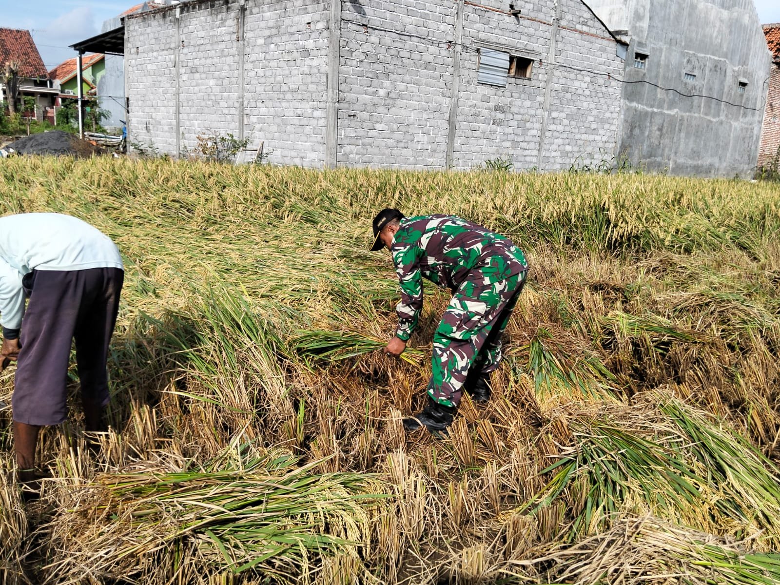 Peltu Supaedi membantu petani yang sedang memanen padi dalam rangka mendukung dan mensukseskan program serapan gabah di wilayah setempat.