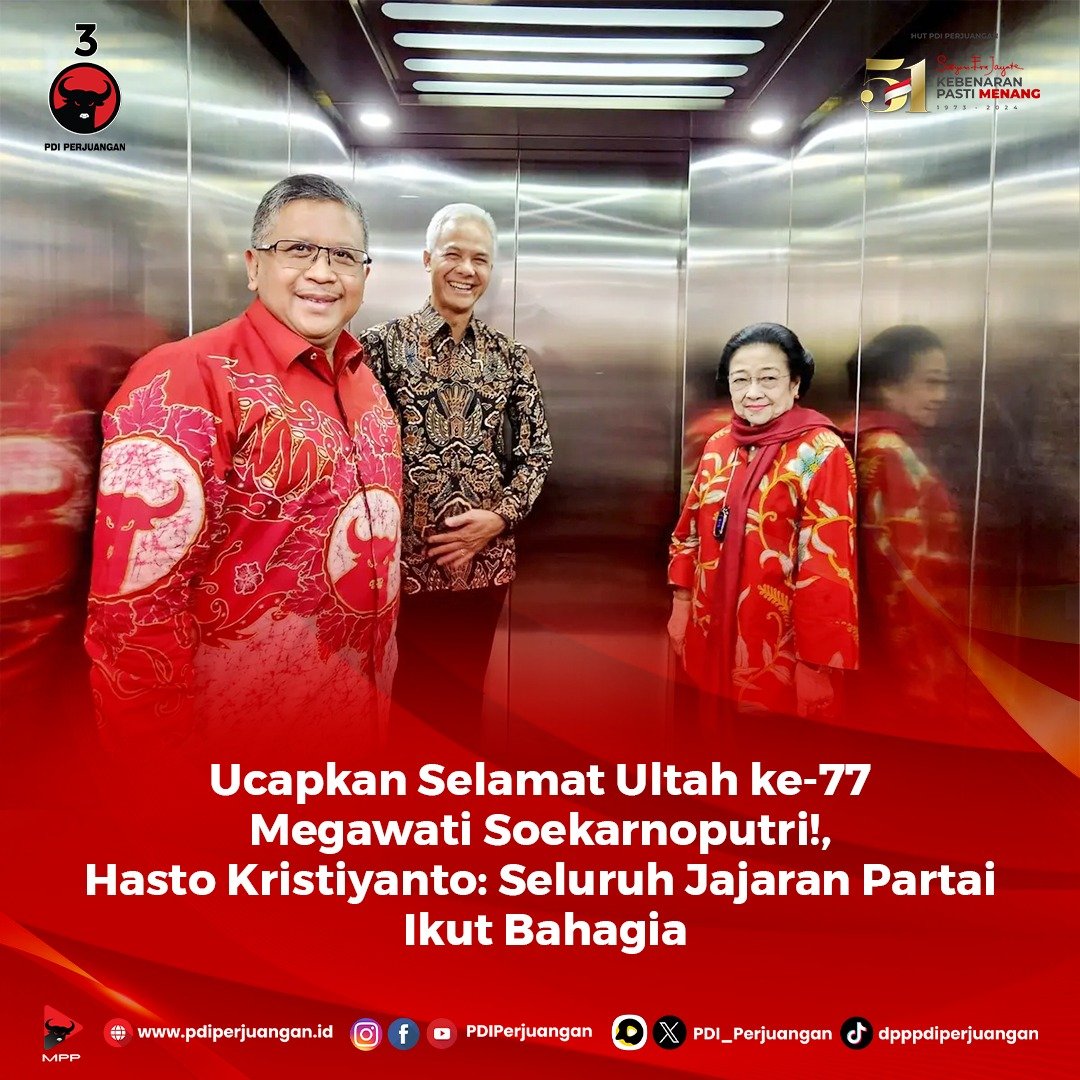 “Izinkan kami menyampaikan selamat ulang tahun untuk Ibu Megawati, semoga Bu Mega selalu sehat, dipanjangkan umurnya selalu dalam kebahagiaan, keberkahan, dan terus menjadi tiang kokoh tegar dalam menjaga konstitusi dan demokrasi kita,” katanya.