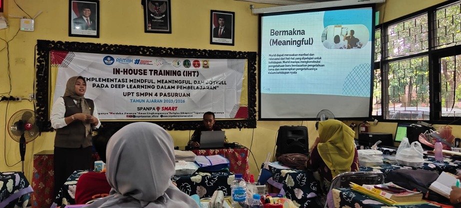 JATIM | SUDUTPANDANG.ID – UPT SMP Negeri 4 Pasuruan kembali menggelar kegiatan peningkatan kompetensi guru melalui program In-House Training (IHT) pada Kamis, 6 November 2025. Kegiatan ini menghadirkan narasumber pengawas pendidikan dari Dinas Pendidikan dan Kebudayaan, yaitu Ibu Citra Dwi Wijayanti, M.Pd, yang selama ini dikenal aktif dalam penguatan implementasi pembelajaran Kurikulum Merdeka serta inovasi strategi pembelajaran berbasis penguatan karakter.