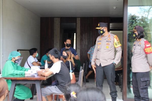 BADUNG, SUDUTPANDANG.ID – Polres Badung AKBP Leo Dedy Defretes, turun langsung memantau pelaksanaan vaksinasi dosis II Astra Zeneca di Hotel Alila, Jalan Petitenget Lingkungan Uma Sari, Kelurahan Kerobokan Kelod, Kecamatan Kuta Utara, Kabupaten Badung, Bali, Kamis (12/8/2021) siang 11.30 Wita.