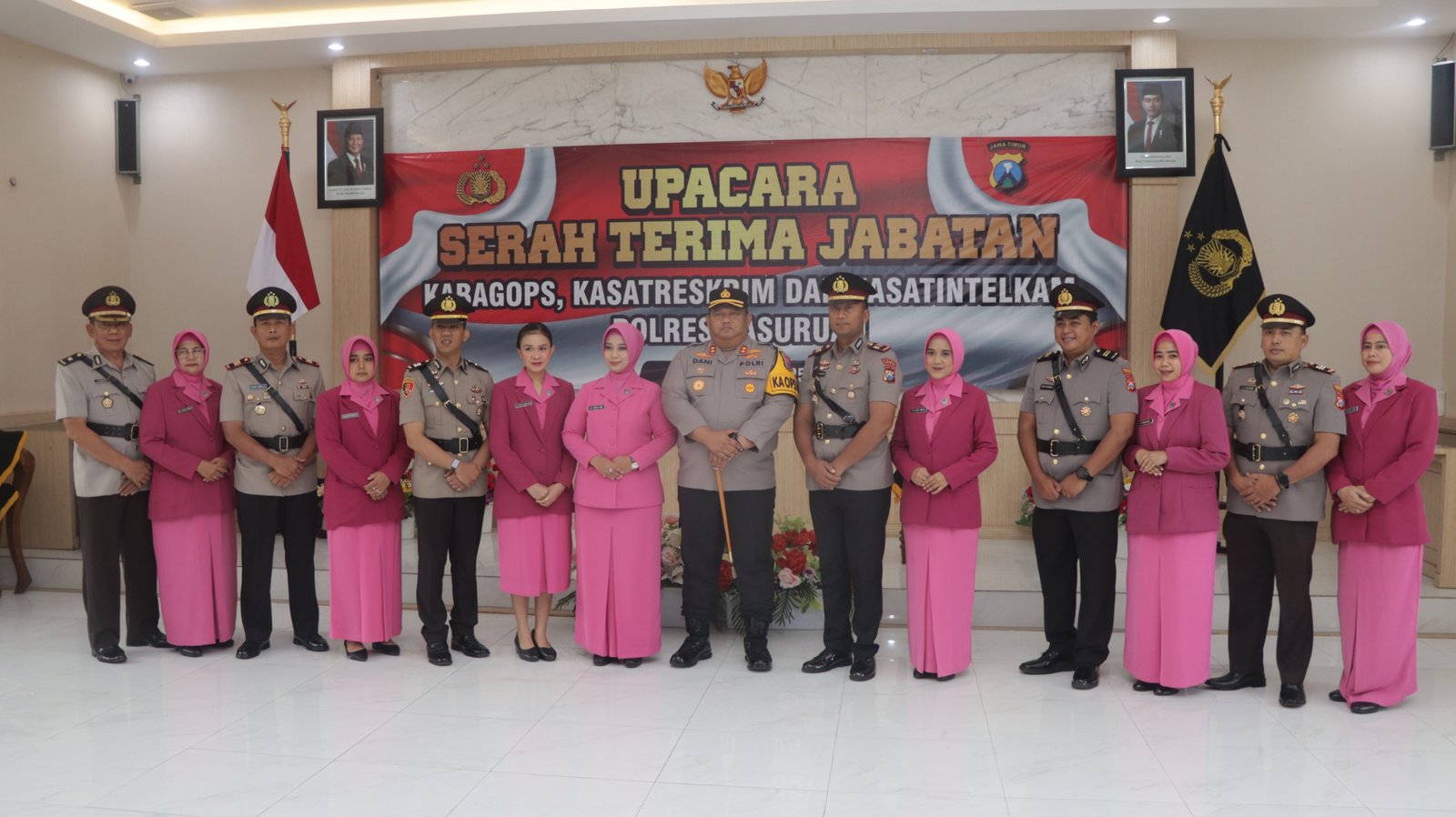 PASURUAN – JATIM | SUDUTPANDANG.ID – Kapolres Pasuruan, AKBP Jazuli Dani Iriawan, memimpin upacara serah terima jabatan (sertijab) pejabat utama Polres Pasuruan, yakni Kabag Ops, Kasat Reskrim, dan Kasat Intelkam di Mapolres Pasuruan, Kamis (23/01/2025).