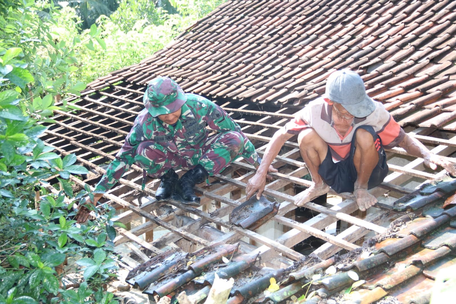Pembongkaran rumah dipimpin anggota Pra TMMD, Serda Anas Tauvik selaku Bintara Pembina Desa (Babinsa), dengan melibatkan warga yang bergotong royong membantu proses pelepasan atap, dinding, hingga pemilahan material bangunan lama yang masih dapat digunakan kembali untuk pembangunan berikutnya.