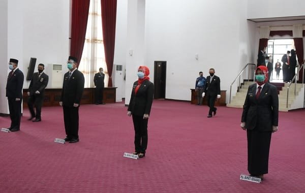 Gubernur Kalbar H Sutarmidji, SH, M.Hum, melantik 4 Pejabat Sementara (Pjs) Bupati dalam rangka mengisi kekosongan jabatan Bupati yang sedang cuti Pilkada di Balai Petitih Kantor Gubernur Kalbar, Sabtu (26/9/2020)/ist.