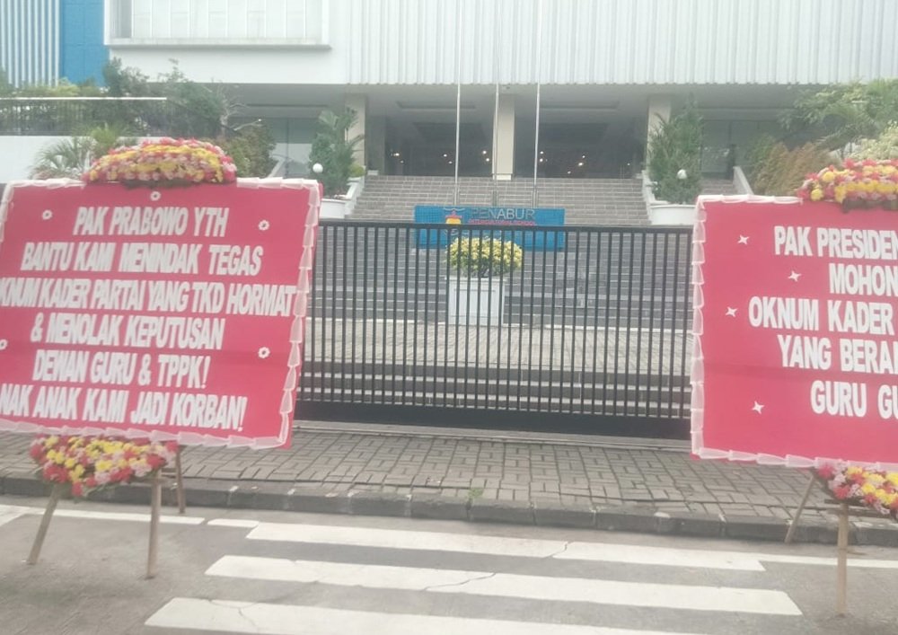 Tampak papan bunga berjejer di halaman gedung sekolah, salah satunya bertuliskan: ‘Pak Prabowo Yth, Bantu Kami Menindak Tegas Oknum Kader Partai yang Menolak Keputusan Dewan Guru dan TPPKI. Anak-anak Jadi Korban.”