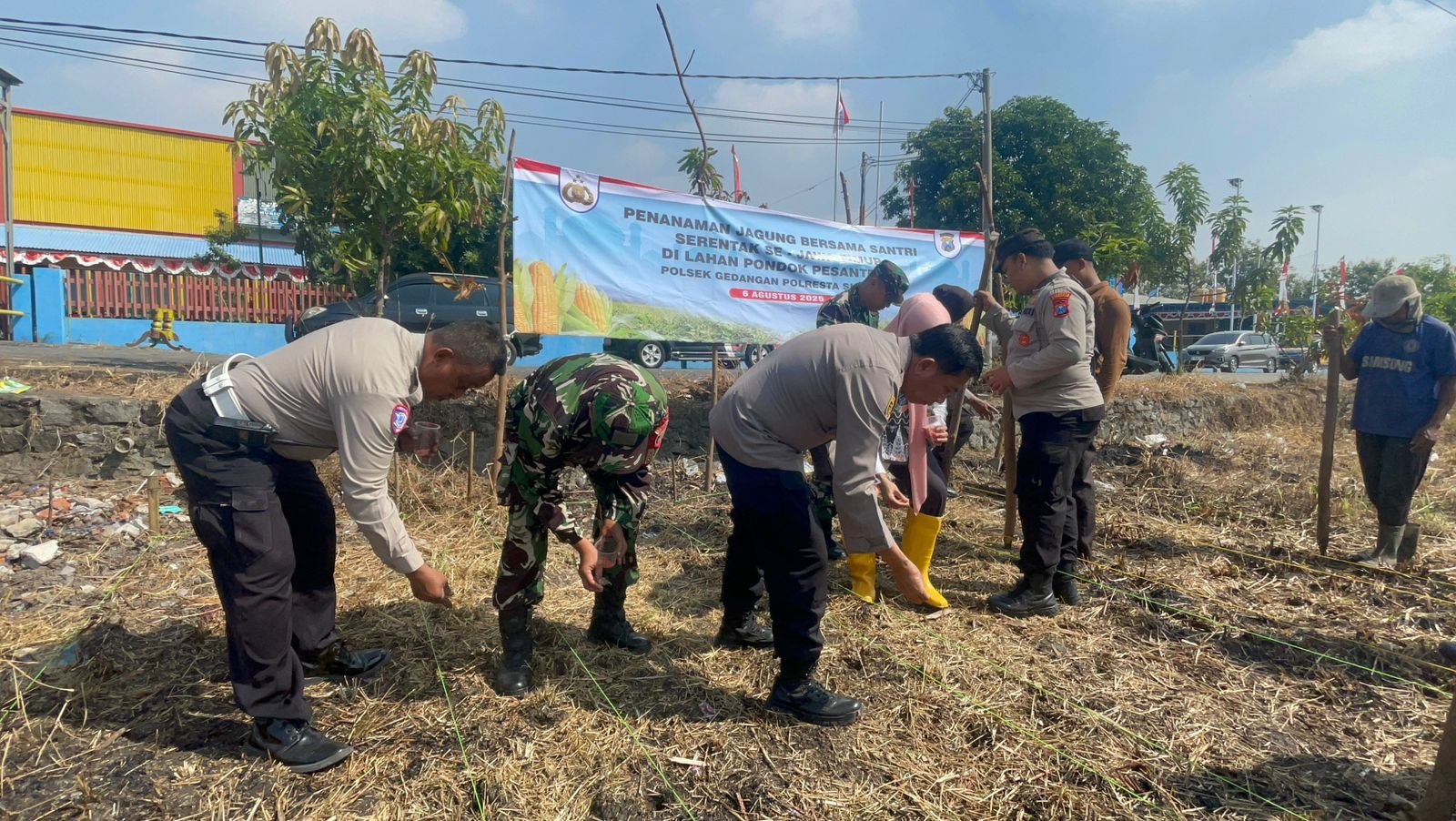 SIDOARJO – JATIM | SUDUTPANDANG.ID-Dalam upaya mendukung ketahanan pangan nasional, Polsek Gedangan mengikuti kegiatan penanaman jagung serentak, Rabu (6/8/2025). Kegiatan dengan pemanfaatan lahan tidur di Desa Semambung ini juga dihadiri Forkopimka setempat dan tokoh agama.