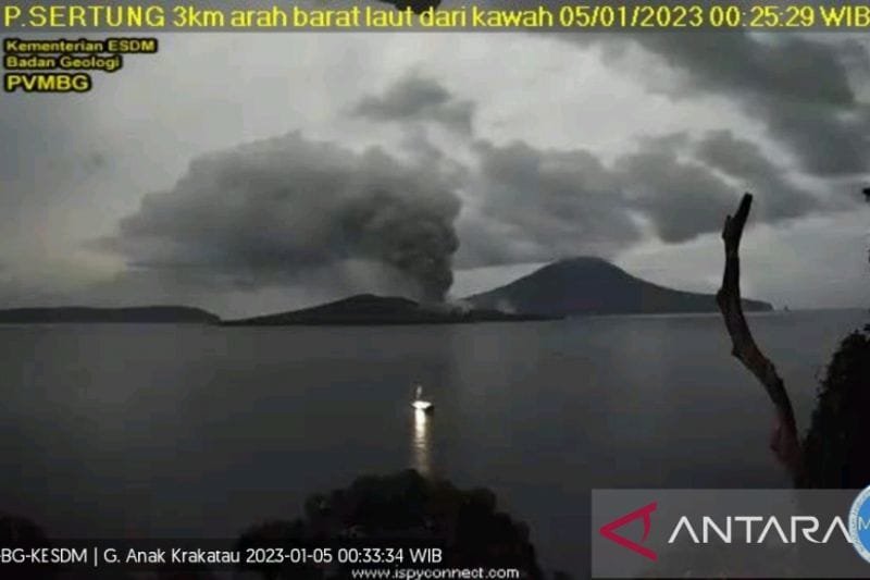 LAMPUNG SELATAN, SUDUTPANDANG.ID – Gunung Anak Krakatau (GAK) berada di wilayah Provinsi Lampung, Kamis (5/1/2023) dini hari pukul 00.13 WIB mengalami erupsi (meletus) lagi, menyemburkan abu dengan tinggi kolom kurang lebih 750 meter di atas puncak atau sekitar 907 meter di atas permukaan laut, kata petugas di pos pantau gunung api tersebut.