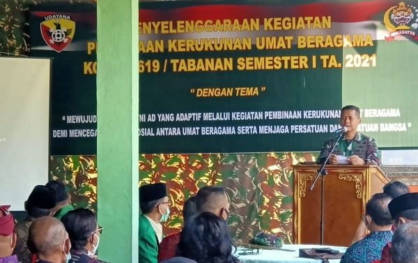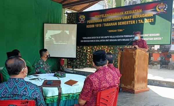 Penyelenggaraan kegiatan pembinaan kerukunan umat beragama Kodim 1619/Tabanan Semester I TA 2021 mengusung tema “Mewujudkan Binter TNI-AD yang Adaptif Melalui Kegiatan Pembinaan Kerukunan Umat Beragama Demi Mencegah Konflik Sosial Antar Umat Beragama serta Menjaga Persatuan dan Kesatuan Bangsa”.