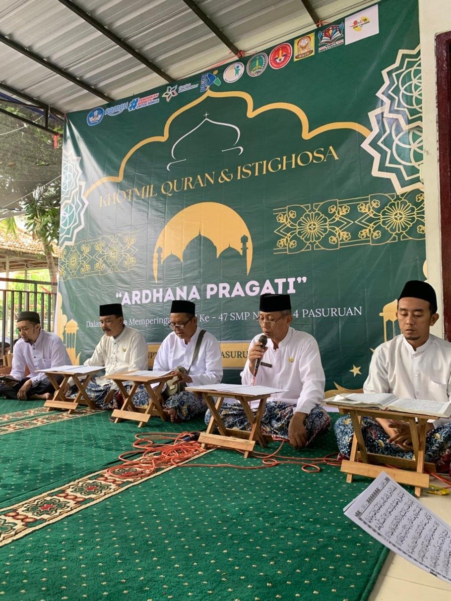 Selain khotmil Qur’an, kegiatan juga dilanjutkan dengan istighotsah dan doa bersama yang dipimpin oleh kepala sekolah dan didampingi guru Pendidikan Agama Islam. Dalam momen tersebut, seluruh peserta memanjatkan doa sebagai ungkapan rasa syukur atas perjalanan panjang sekolah serta memohon keberkahan, keselamatan, dan kemajuan bagi seluruh warga SMP Negeri 4 Pasuruan.