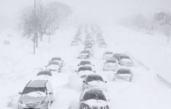 Dalam cuaca yang membeku dan jarak pandang terbatas, petugas kepolisian setempat turun ke jalan raya untuk mengatur lalu lintas.