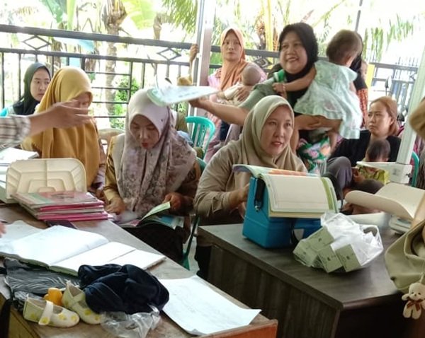 Bidan desa, Yozi Martini dan Dwi Davit, menyampaikan penyuluhan kesehatan mengenai pentingnya imunisasi, pemenuhan gizi seimbang, serta upaya menjaga tumbuh kembang anak.