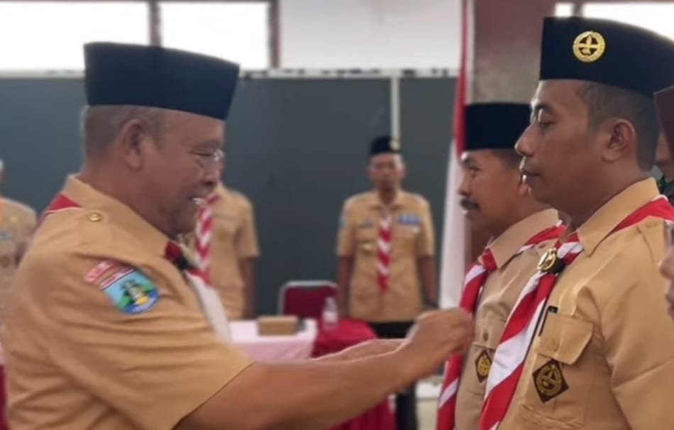 Wakil Kwarcab Gerakan Pramuka Kwarcab Kabupaten Kediri, Mokhamat Muhsin saat melantik jajaran pengurus Kwarran Ngadiluwih masa bakti 2025–2028. (Foto: Chandra Nurcahyo)