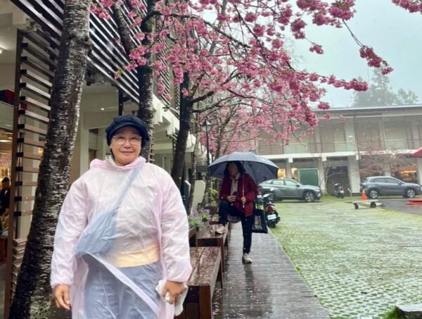 Udara pegunungan yang sejuk, rintik hujan, serta mekarnya bunga sakura di sekitar lokasi menambah keindahan suasana. Momen tersebut menjadi kesempatan yang sempurna untuk berfoto dan mengabadikan kenangan.
