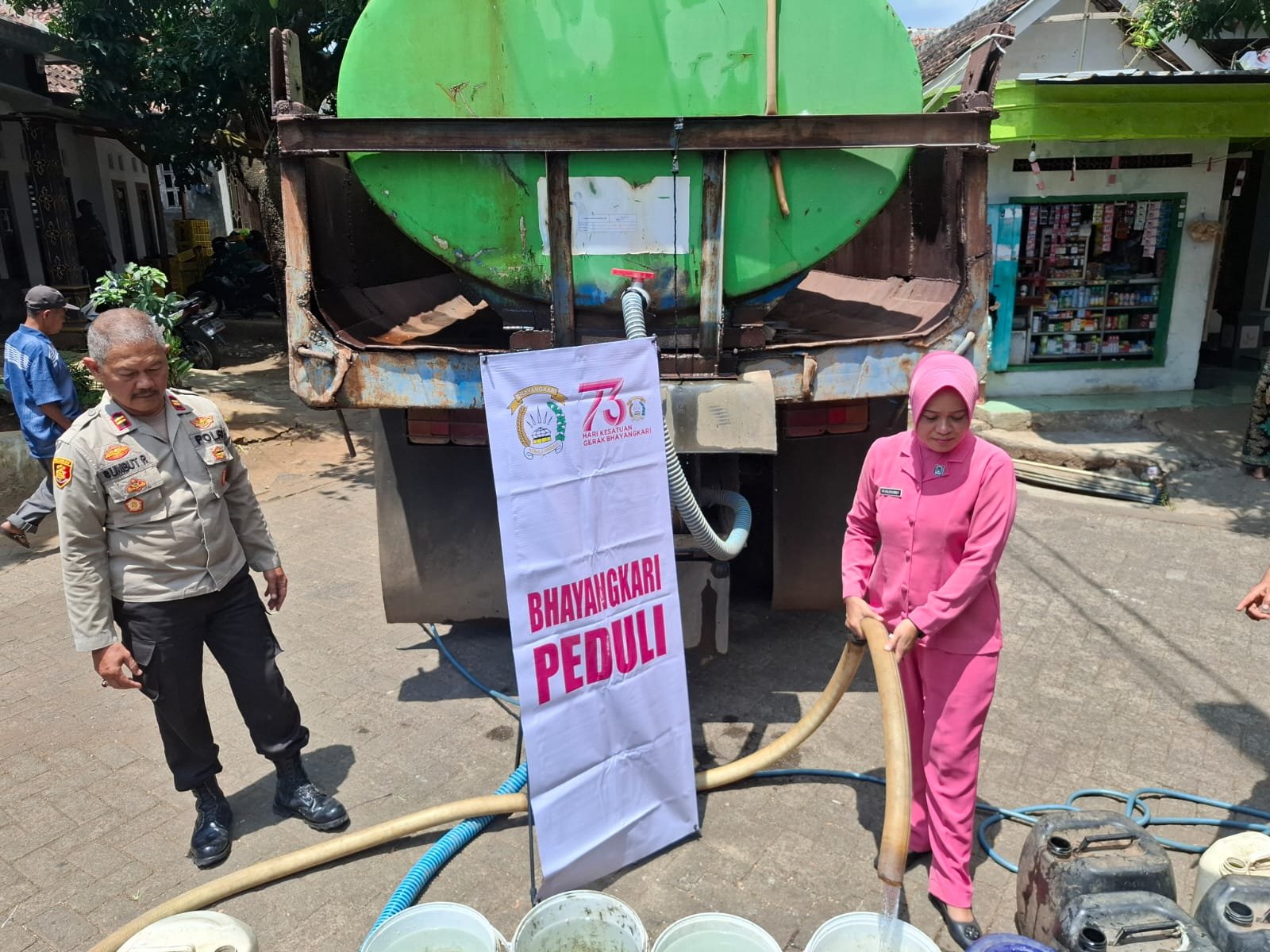 Selain menyalurkan air bersih, Kapolsek juga berdialog dengan warga serta Kepala Dusun Jatisari untuk mendengarkan langsung keluhan mereka terkait kesulitan mendapatkan air bersih.