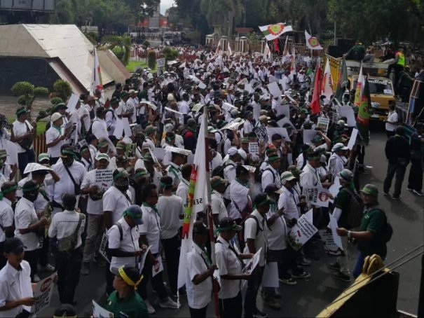 BONDOWOSO-JATIM|SUDUTPANDANG.ID-Ribuan pekerja Perkebunan Nusantara yang tergabung dalam Serikat Pekerja Perkebunan Nusantara XII (SPBUN NXII) menggelar aksi damai di Kantor Pemerintah Kabupaten (Pemkab) Bondowoso, Jawa Timur, Selasa (6/1/2025).