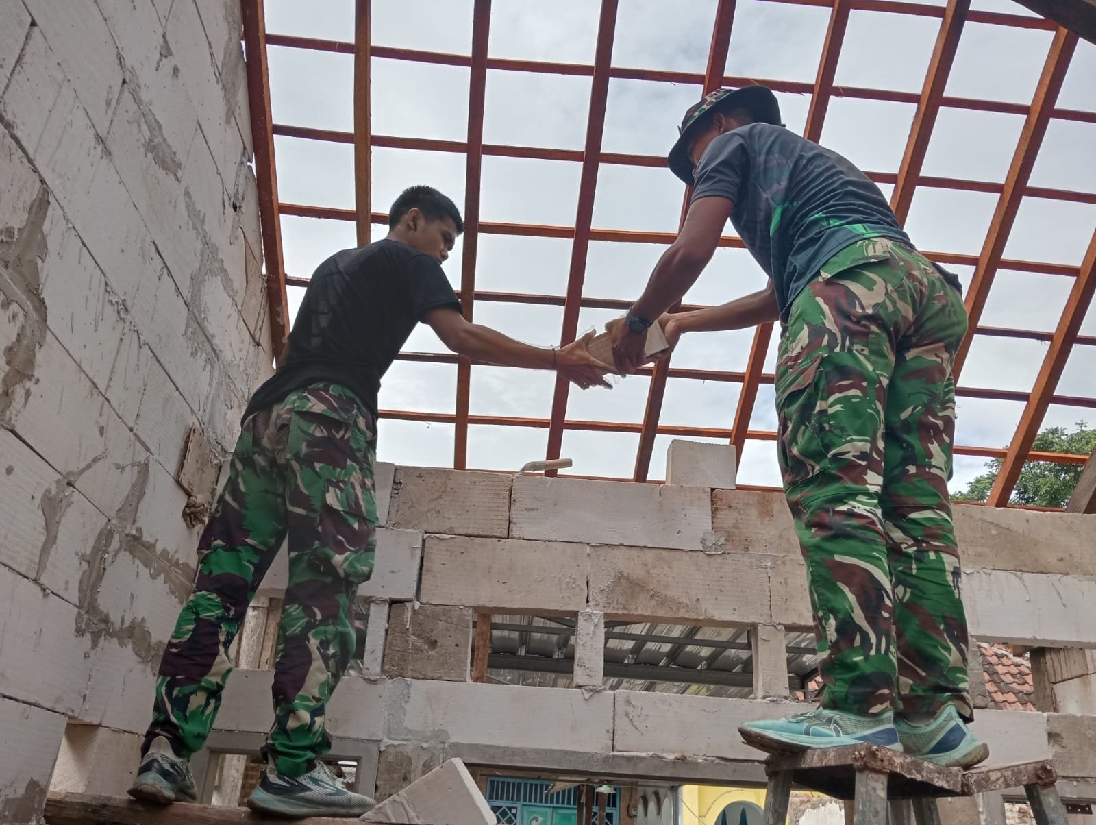 Tahap krusial telah tiba pemasangan genteng mulai dilakukan. Atap yang dulu mungkin hanya terdiri dari seng bolong atau bahkan terbuka, kini perlahan tertutup rapat, menjanjikan perlindungan dari hujan dan panas bagi keluarga Yusron. Prajurit Satgas TMMD, dengan seragam loreng khas dan topi kamuflase, bahu-membahu bersama warga. Ada yang mengangkat genteng dari tumpukan, ada yang menyusun dengan teliti di atas rangka kayu, sementara yang lain mengaduk adonan semen di bawah.
