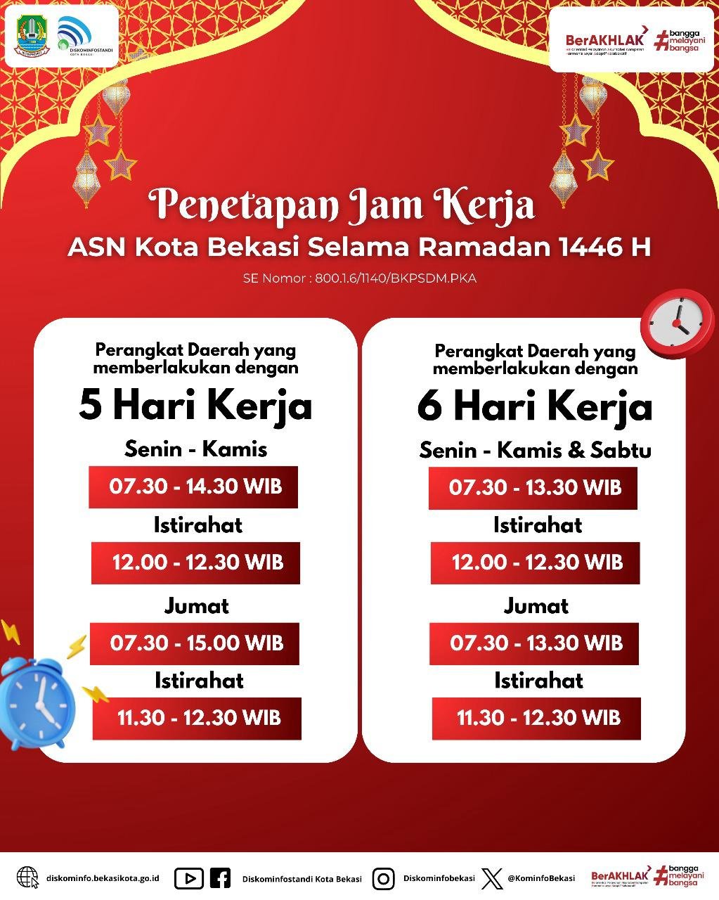 Kota Bekasi, Sudutpandang. id – Berdasarkan Peraturan Presiden Republik Indonesia Nomor 21 Tahun 2023 tentang Hari Kerja dan Jam Kerja Instansi Pemerintah dan Pegawai Aparatur Sipil Negara, Pemerintah Kota Bekasi melalui Badan Kepegawaian dan Pengembangan Sumber Daya Manusia (BKPSDM) mengeluarkan Surat Edaran Nomor : 800.1.6/1140/BKPSDM.PKA tentang penetapan jam kerja pada bulan Ramadhan 1446 Hijriah bagi aparatur pemerintah Kota Bekasi Jumat (28/2/15)