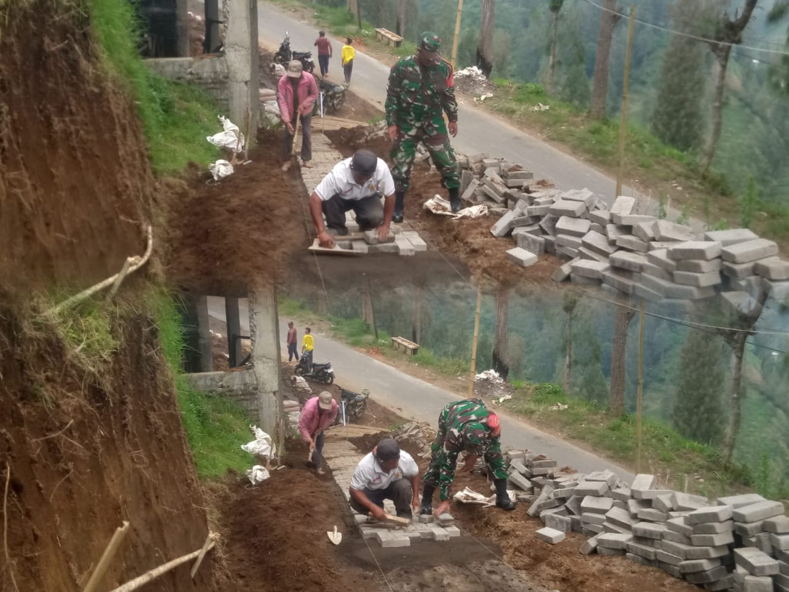 Kebersamaan dan semangat gotong royong kembali terpancar di Dusun Wonopolo, Desa Tosari, Kecamatan Tosari, saat Babinsa Koramil 0819/26 Tosari, Serka Yulianto, memimpin langsung kegiatan karya bakti pemasangan paving dan perbaikan jalan menuju dusun tersebut. Kegiatan ini melibatkan partisipasi aktif warga setempat yang dengan penuh antusias bahu-membahu memperbaiki infrastruktur desa demi kenyamanan bersama. Sabtu (25/4/26).