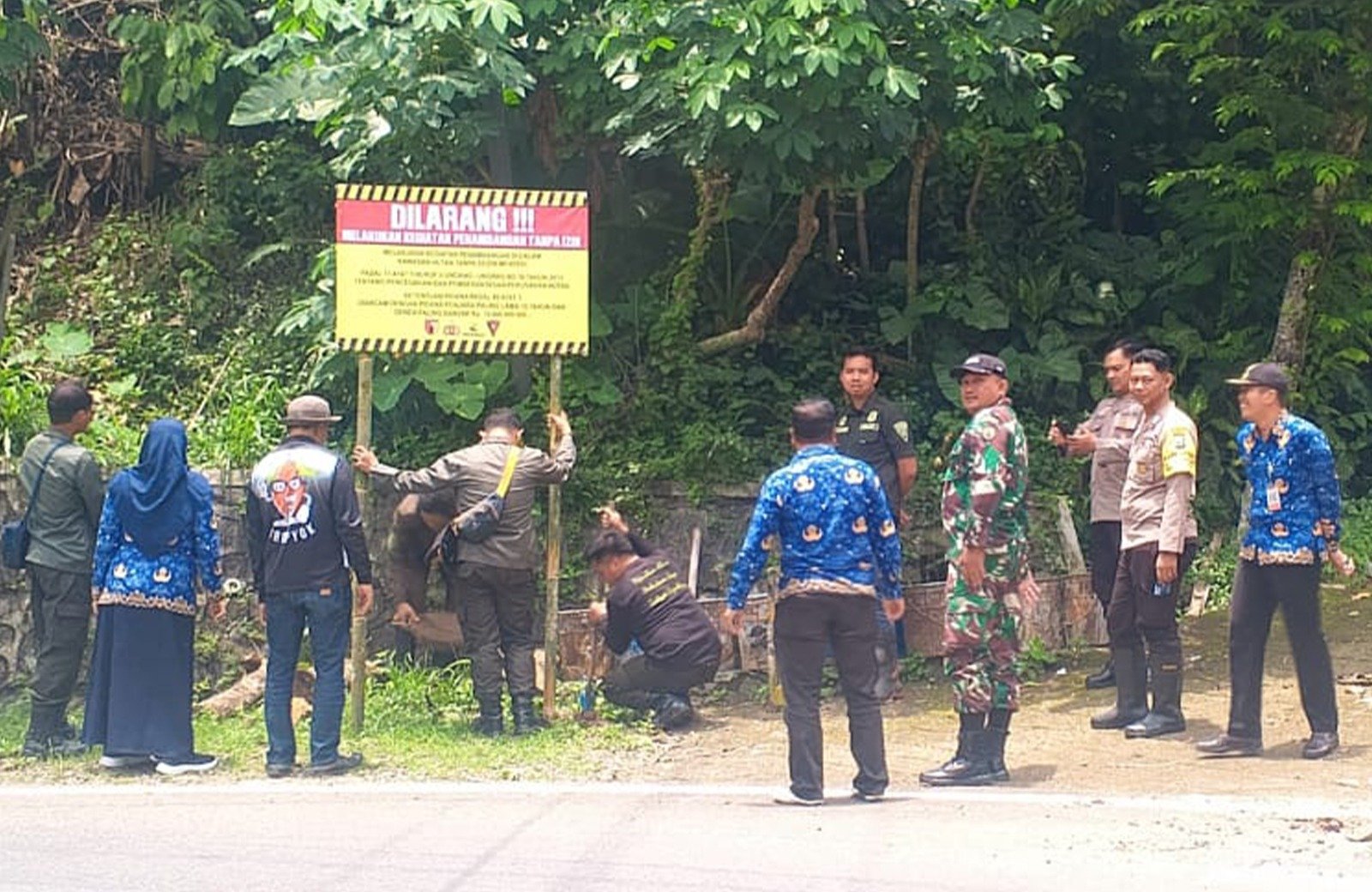 Pemasangan papan larangan tidak hanya dilakukan di satu titik, tetapi di beberapa lokasi strategis di kawasan hutan yang rawan aktivitas penambangan liar. Papan bertuliskan “Dilarang Melakukan Penambangan Tanpa Izin (Illegal Mining)” dipasang di area-area yang sebelumnya sempat terpantau adanya aktivitas mencurigakan. Kegiatan ini turut melibatkan aparat Polsek Dongko, petugas Perhutani, serta perangkat desa setempat.