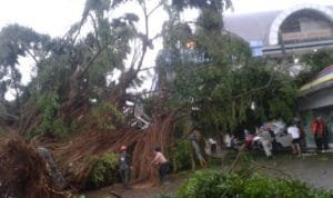 Tangsel, Sudut Pandang.id-Sebuah pohon beringin besar tumbang dan atap plafon lantai 2 Stasiun Serpong ambruk…
