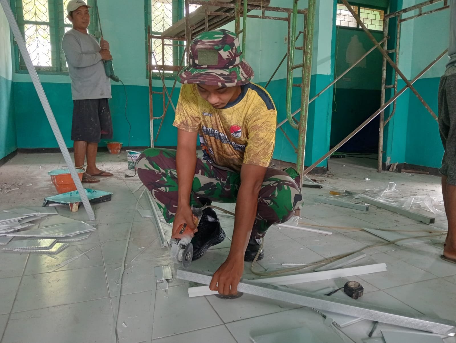 Suara gergaji listrik memecah pagi di halaman SMP Negeri 2 Gondangwetan. Prajurit berseragam loreng TNI AD tampak bergantian naik tangga bambu memasang plafon gypsum baru, sementara rekannya memotong rangka baja ringan dan mengecat dinding yang sebelumnya kusam dan retak.