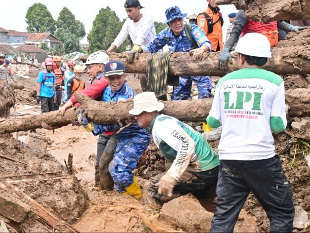 Di lokasi kejadian, personel Lanud Husein Sastranegara bersama relawan bahu-membahu membersihkan material longsor serta membantu proses evakuasi dan penanganan wilayah terdampak.