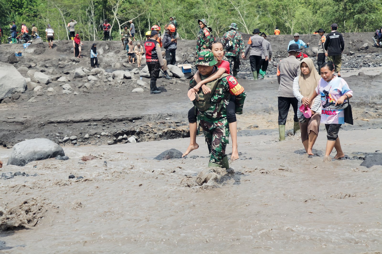 Dengan seragam lapangan yang basah dan lumpur yang mencapai lutut, Sertu Joko Pramono tetap melangkah mantap dan penuh kehati-hatian, memastikan anak tersebut mencapai tempat aman. Di belakangnya, warga tampak berjalan perlahan mengikuti arahan, sementara personel TNI dan Polri lainnya menjaga jalur evakuasi serta memantau perkembangan debit aliran lahar.
