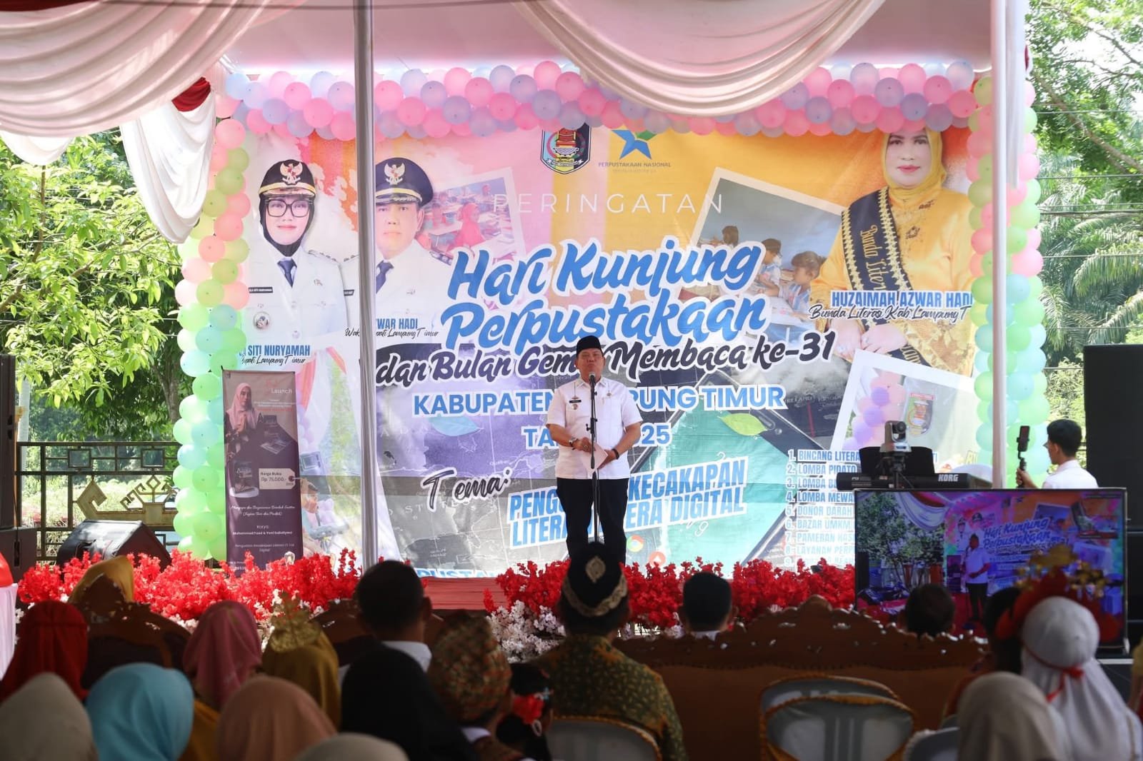 Kegiatan yang mengusung semangat “Membaca untuk Maju, Literasi untuk Semua” ini dihadiri oleh Bunda Literasi Kabupaten Lampung Timur, Huzaimah Azwar Hadi, Kepala Dinas Perpustakaan dan Kearsipan M. Ridwan, Kadis Pendidikan Marsan, para kepala sekolah, guru, serta ratusan pelajar dari jenjang PAUD hingga SMP/MTs.