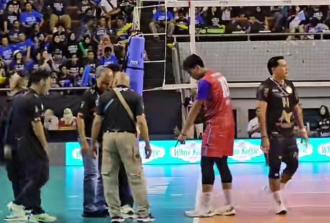 Hujan deras yang mengguyur wilayah tersebut menyebabkan air masuk ke area lapangan, tepatnya di dekat posisi wasit kedua. Laga Livoli Divisi Utama 2025 antara Perumda Tirta Bhagasasi dan Indomaret dihentikan saat memasuki set kedua, dengan skor sementara 1-0 untuk keunggulan Perumda Tirta Bhagasasi.