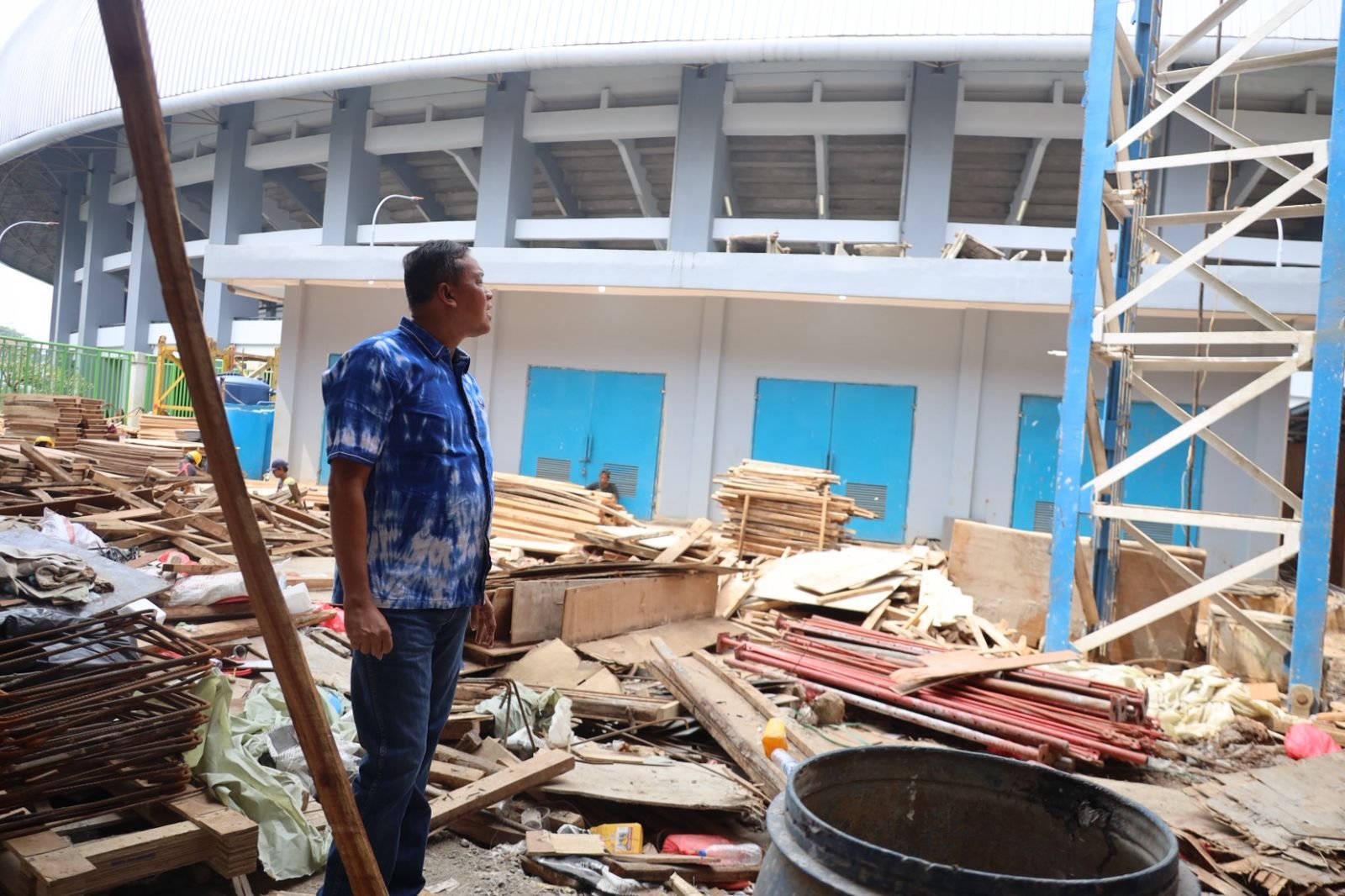 Wali Kota Bekasi, Tri Adhianto memantau langsung progres pembangunan Gedung Olahraga (GOR) untuk cabang voli dan badminton yang berlokasi di area Stadion Patriot Candrabhaga.